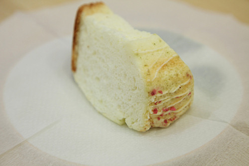 卵白のみを使用したケーキで、この右側の先には、桜色のフレークが。